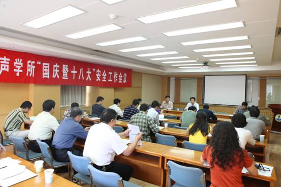 在国庆节即将来临、党的“十八大”召开在即之际,为了切实做好国庆节和“十八大”期间的安全稳定工作,确保我所内部安全,9月19日上午,声学所召开迎接国庆和十八大安全工作会议,支部书记及所属各部门安全负责人参加了会议。会议对做好国庆、十八大安全保卫工作进行了动员部署。所党委书记张春华出席会议。