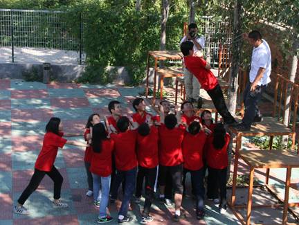 周末的拓展训练在昌平的专业基地进行,天高云淡,景色宜人。由于本次参训人员数量突破历史,首次分成三队共同进行。在培训师的引导下,大家集思广益、精诚合作。三位女队长巾帼不让须眉,带领着队伍用最快的时间完成了团队组建,“紫山龙”队员斗志昂扬,“蛟龙”队员睿智自信,“雷火霹雳”队热情干练。大家口号喊得响亮,歌声唱得火热。三只队伍毫不退缩,用飞快的速度完成了“高空断桥”、“信任背摔”、“目标市场”、“毕业墙翻越”等充满挑战的项目。“高空断桥”中,四层楼高的高台上矗立着两块间隔一米左右的“断桥”,每位成员不能借助绳索,完全靠勇气和意志力完成跨越,队员们在大家的加油呐喊中奋勇向前,一个个跨越空中和心中的那条鸿沟;“目标市场”中,未知区域中散落着等待解密的图纸,在有限的时间内需要组长与组员们通力合作,把他们一一破译和找出,每支队在各自的阵营中绞尽脑汁设计策略,每个人尽职得扮演着自己的角色,用智慧和团结合力创造速度的记录;“信任背摔”中,每位队员认真听取并练习教练教给的保护动作,用坚毅的目光给予背摔队友以信心,大家一个个的“倒下”既说明了大家对自身心理障碍的逾越,也表现了每个人对团体的充分信任;“毕业墙翻越”项目中,墙下的队员默默无闻地甘做人梯,墙上的队员奋力拼搏,将队友们一个个地送到高耸的墙头之上,大家翻越过程中,没有人因为暴晒而抱怨,没有人因为胆怯而退缩,没有人因为体弱而放弃…在每个项目后,大家都围成一圈进行了心得共享。大家都意识到这些项目看似简单,但依靠个人的力量根本完成不了,需要项目开始之前进行彼此良好的沟通,建立起充分的信任,在行动中分工明确、通力合作,依靠集体的智慧和个人的信念才能战胜一个个调整、完成一个个目标。在拓展总结会上,大家仍然没有从激烈的团队项目中走出来。大家在拓展回顾中一次次的鼓掌,眼中闪现着兴奋的泪光,就连曾经略显内向的员工也作为新职工代表做了感言分享。大家对于自我潜能挖掘和团队协作精神都有了更为深刻的感悟,相信拓展经历中一幕幕感人的场景必将激励新职工们在今后的团队工作中取得佳绩。