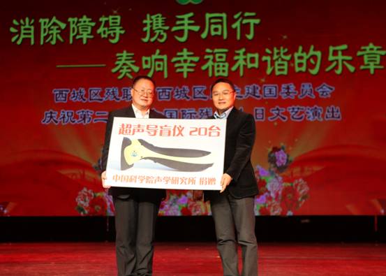 2012年12月3日,时逢第21个国际残疾人日,超声导盲仪捐赠仪式在西城区文化中心举行。声学所副所长、副书记倪宏代表中科院声学所向北京市西城区残疾人联合会捐赠超声导盲仪20台。北京市残联、西城区政协和西城区残联的领导以及声学所相关科研人员出席了捐赠仪式。