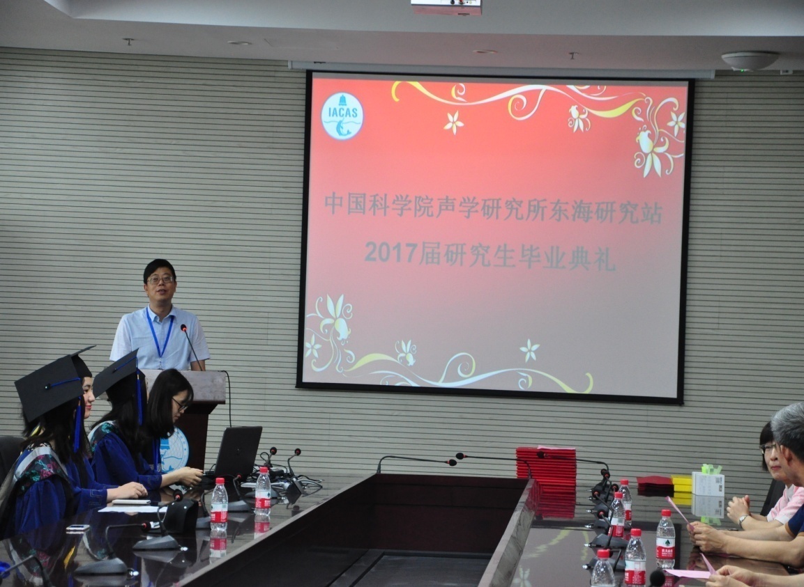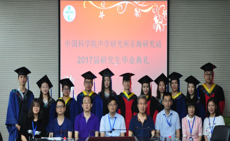 又是一年收获季,又是一年毕业至。声学所东海站2017届研究生毕业典礼于2017年6月23日上午在嘉定园区一楼报告厅举行。站长许伟杰、党委书记胡长青、副站长刘晓隽、导师代表王润田研究员、冯海泓研究员、朱安珏副研究员、人教科工作人员、全体毕业生参加了毕业典礼。