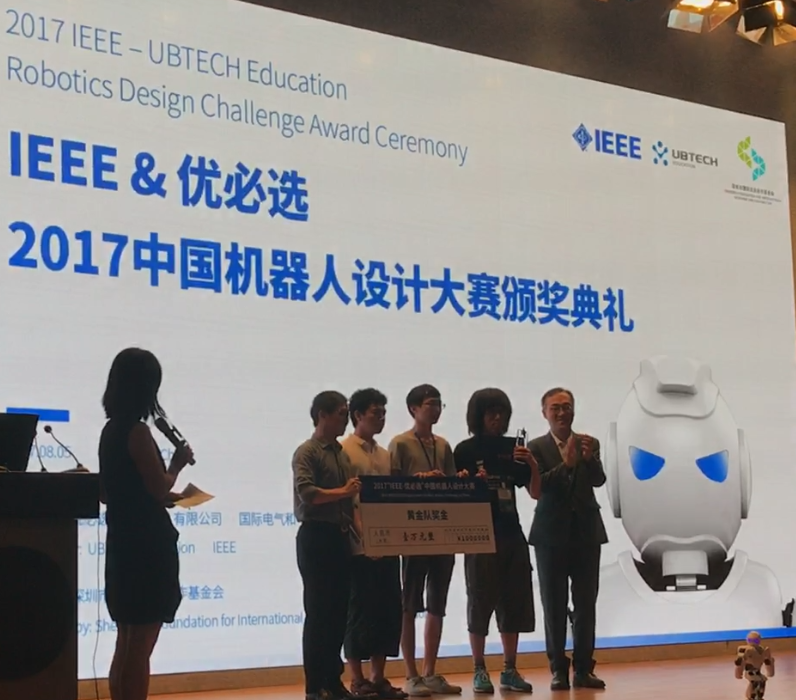 2017年8月5日,首届“IEEE-优必选中国机器人设计大赛”总决赛在深圳圆满收官,本次比赛共有来自全国各高校的上百支团队,超过800名学生参加。决赛中,来自两岸三地的26支战队汇聚深圳,展开了一场创意与技术间的激烈较量。最终,中科院声学所国家网络新媒体工程技术研究中心博士生杨骏同学率领的中国科学院大学UCAS Boys队荣获大赛金奖。
