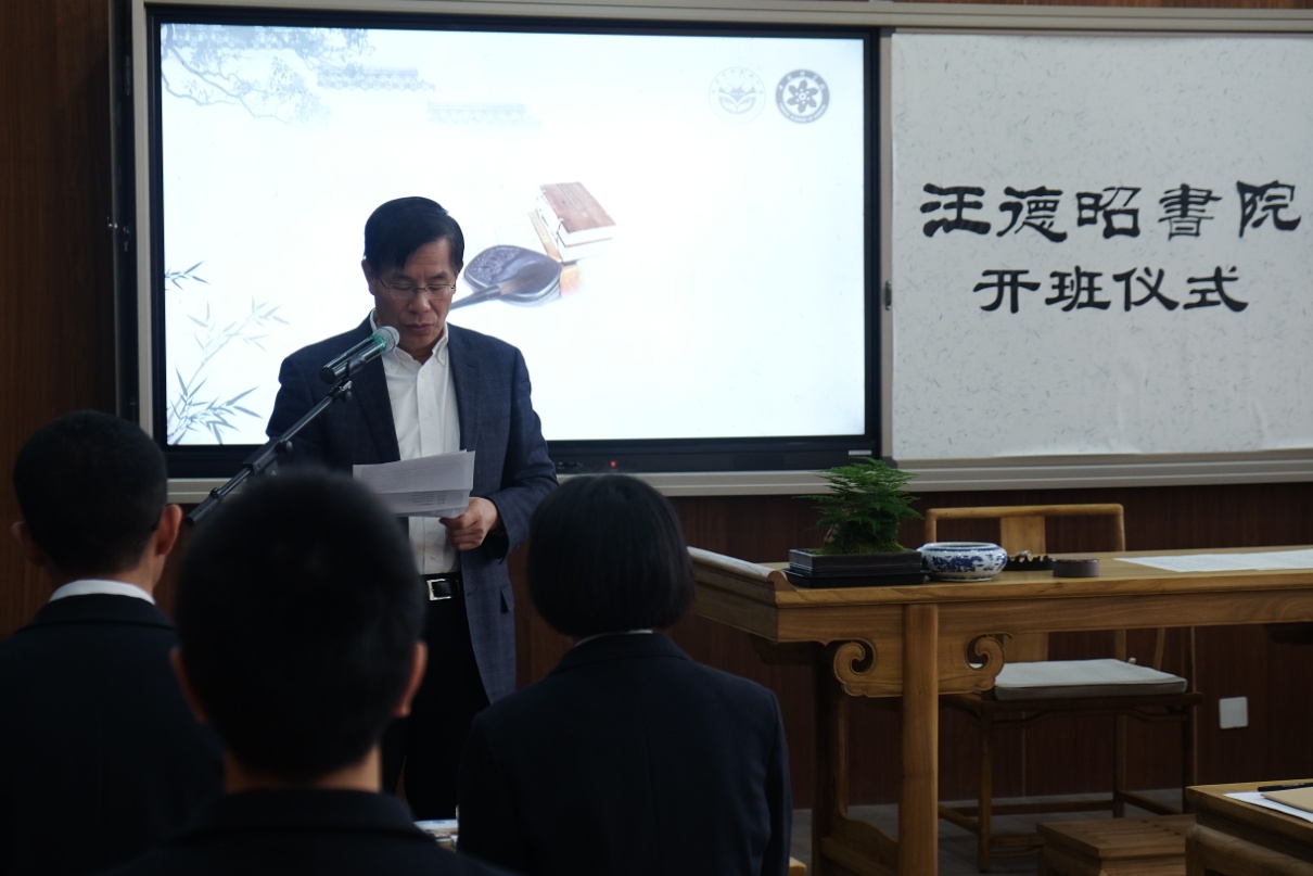 全体师生及来宾按照古代书院的传统礼敬先贤并观看了汪德昭院士生平记录片。邓麦村秘书长致辞,他祝贺汪德昭书院顺利开班,高度肯定所校合作创立书院秉持的“科教协同、共育英才”的创新模式,表示中科院将在“3H”工程计划中持续支持书院建设。