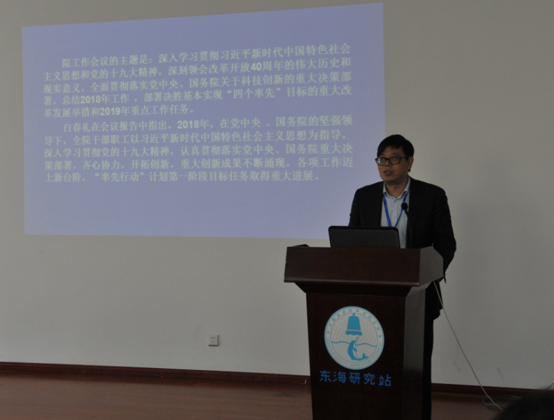 李浩然书记代表声学所领导班子对过去一年东海站取得的成绩表示热烈的祝贺,并向东海站人在过去一年中的辛勤付出和奋力拼搏表示衷心的感谢,希望在2019年,在东海站党政班子的正确领导下,全体东海站人能坚持以习近平新时代中国特色社会主义思想为指导,上下齐心,争取百尺竿头,更进一步!