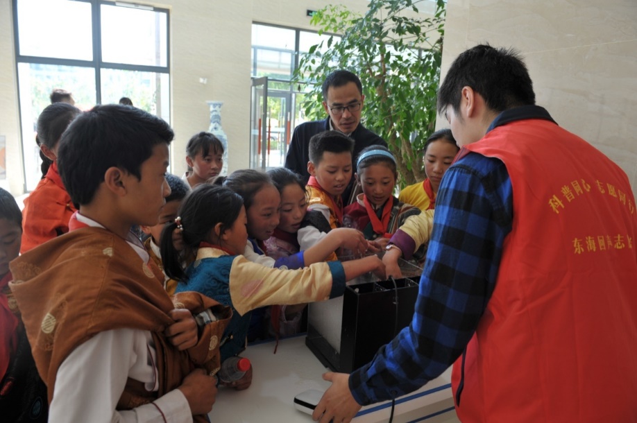随后,支持单位、主办单位等领导及嘉宾分别向久治县政府、白玉乡藏文寄宿制完全小学赠送了蛟龙号模型及《声音的魔力》等百余次册科普图书。