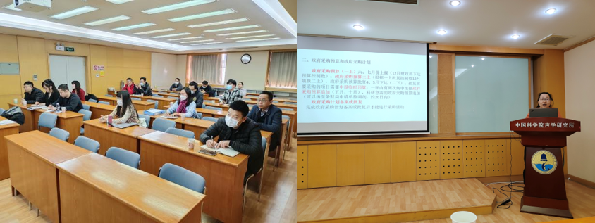 本次培训由资产条件保障部谭书芹主讲,培训内容聚焦声学所政府采购工作中常见问题,围绕政府采购的定义、采购方式、预算填报与执行、注意事项等内容进行了讲解。