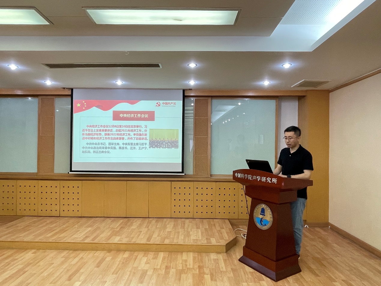学术交流前,声学所青促会小组组长贾晗带领大家共同学习2021年中央经济工作会议精神,并重温了党的十八大以来历次中央经济工作会议。中央经济工作会议是判断当前经济形势和定调第二年宏观经济政策最权威的风向标。作为科研人员,要肩负起新时代赋予的重任,面向国家经济主战场,开展科技创新工作,让科技进步为我国经济实现持续健康的高质量发展作出更大贡献。