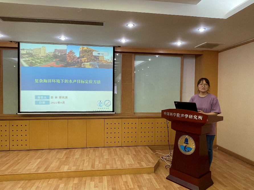 随后,苏林研究员作学术报告《复杂海洋环境下的水声目标定位方法》,介绍了浅海环境下海底参数、声速剖面、阵型等参数失配以及模型失配现象,以及为了解决上述参数失配及模型失配带来的定位误差而采取的多种算法;比较了深海环境与浅海环境的不同,重点介绍了深海定位原理以及相关工作。大家对报告内容兴趣浓厚,开展了深入交流。这不仅加深了大家对彼此现阶段研究主攻方向的了解,也为日常学术探讨、合作提供了契机。