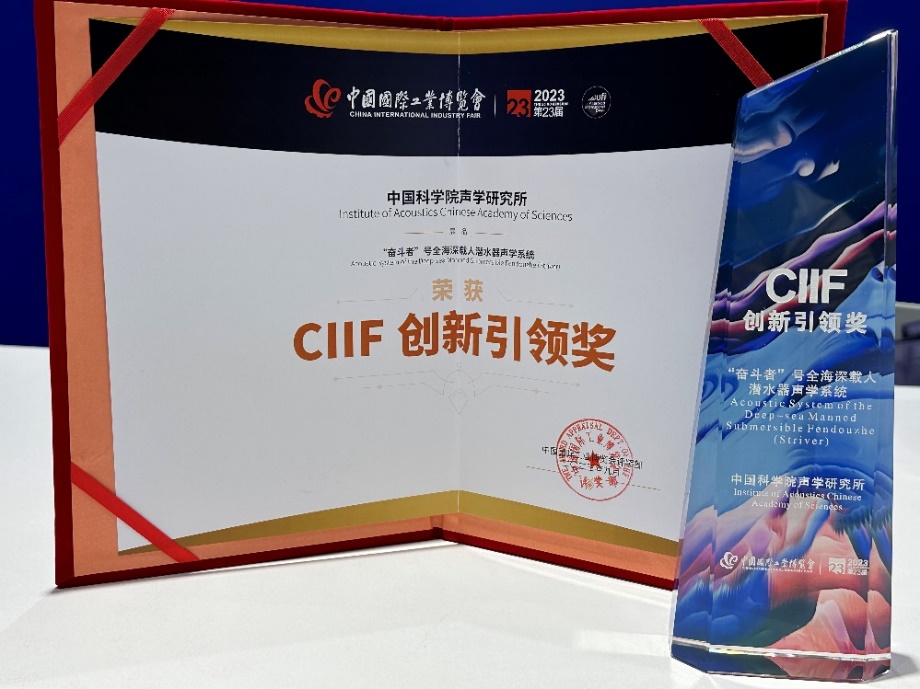 在重大科技任务成果展示区布展的中国科学院声学研究所 “‘奋斗者’号全海深载人潜水器声学系统”获得2023年第23届CIIF创新引领奖。