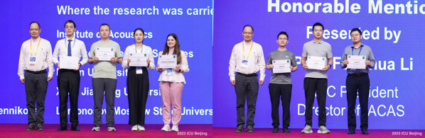 本次大会颁发C.F. Ying Award奖4名,声学所超声学实验室特别研究助理(博士后)刘琳以及来自复旦大学、西安交通大学、罗蒙诺索夫莫斯科国立大学的三位青年学者获得该奖项;颁发C.F. Ying Award Honorable Mention奖4名,来自南方科技大学、智利圣地亚哥大学、哈尔滨工业大学和北京航空航天大学的四位青年学者获得该奖项。