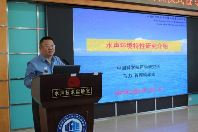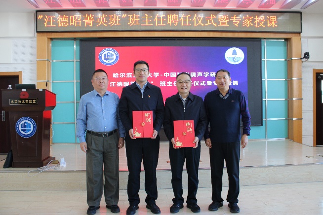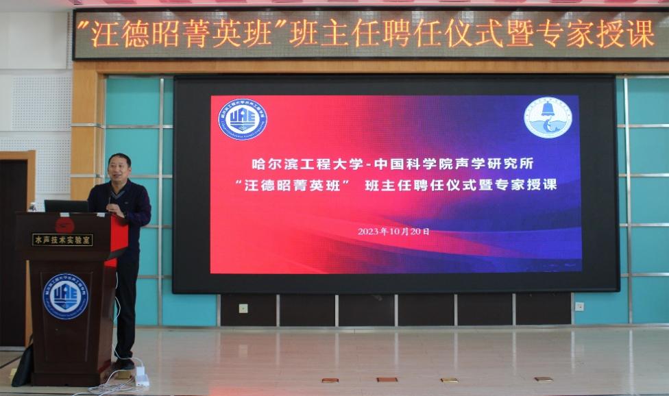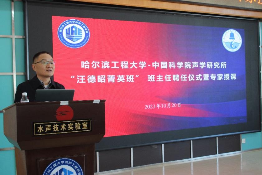 10月20日,中国科学院声学研究所-哈尔滨工程大学“汪德昭菁英班”班主任聘任仪式暨专家授课在水声楼15楼学术报告厅举行。会议由水声工程学院院长乔钢主持,中国科学院声学研究所党委书记、副所长倪宏,首席科学家马力及相关职能部门负责人;学院党委书记万旭东,党委副书记刘志军,副院长张海刚出席仪式。