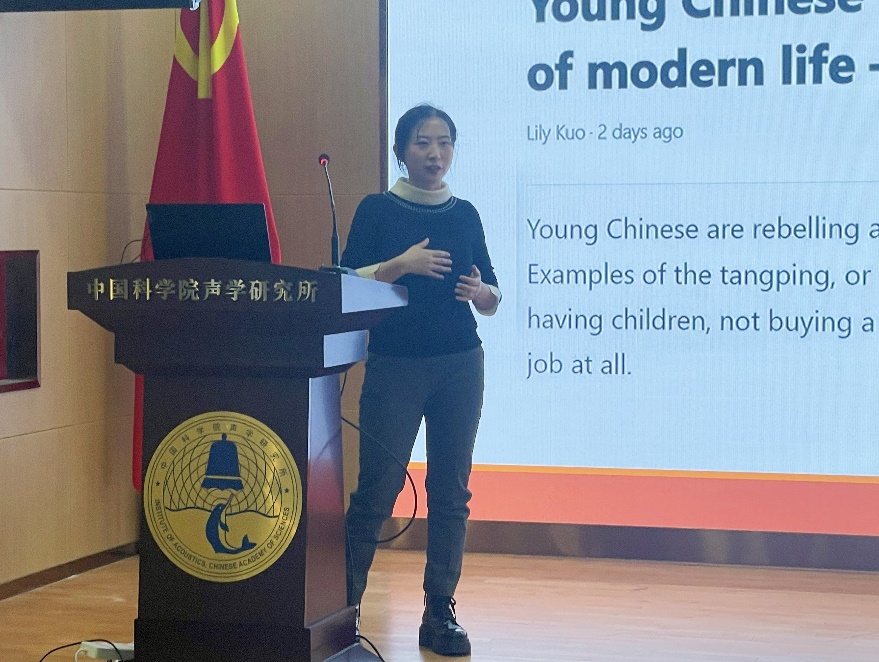 李淑秋、李俊红、孙红灵和邓浩江四位研究员分别介绍了水声、超声、音频、信息与信号学科组学科领域的历史沿革、人物故事、最新研究成果和发展规划等,既凸出老一辈科学家对新职工的精神传承,又集中展示了各学科的丰硕科研成果,既薪火相传,又增进作为声学所一员的自信和自豪。