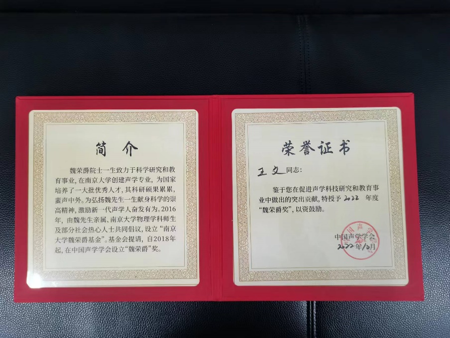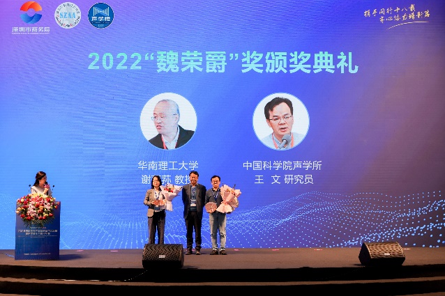 2023年12月16日,南京大学魏荣爵基金会在深圳会展中心举行了2022年度中国声学学会“魏荣爵奖”颁奖典礼,声学所王文研究员荣获声学领域的这项特殊荣誉,并应邀做大会报告。