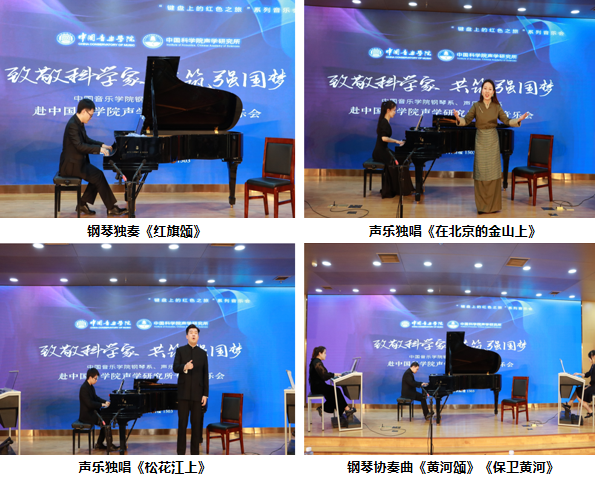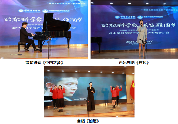 2024年4月24日,声学所举办“致敬科学家 共筑强国梦”专场音乐会,邀请中国音乐学院钢琴系、声乐歌剧系的50余名师生前来交流汇演。中国音乐学院声乐歌剧系张天彤教授、书记徐杨教授、副书记屈丽芳教授,钢琴系副书记杨树教授应邀出席音乐会,所长李风华,副所长李明庚、杨军及各实验室师生代表150余人参加了活动。音乐会由杨军主持、张天彤担任学术导赏。