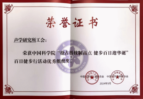 近日,院工会、院体协对组织参加“抢占科技制高点 健步百日迎华诞”2024年职工百日健步行活动的院属单位进行了表彰,我所获优秀组织奖。职工百日健步行活动是院工会、院体协为庆祝中华人民共和国成立75周年和中国科学院建院75周年,深入贯彻落实全民健身国家战略,为我院抢占科技制高点提供健康支撑举办。6月6日在奥林匹克森林公园奉献雕塑广场举行了线下启动仪式,声学所组成了由党委书记、工会主席倪宏同志领队的代表团参加了启动仪式。