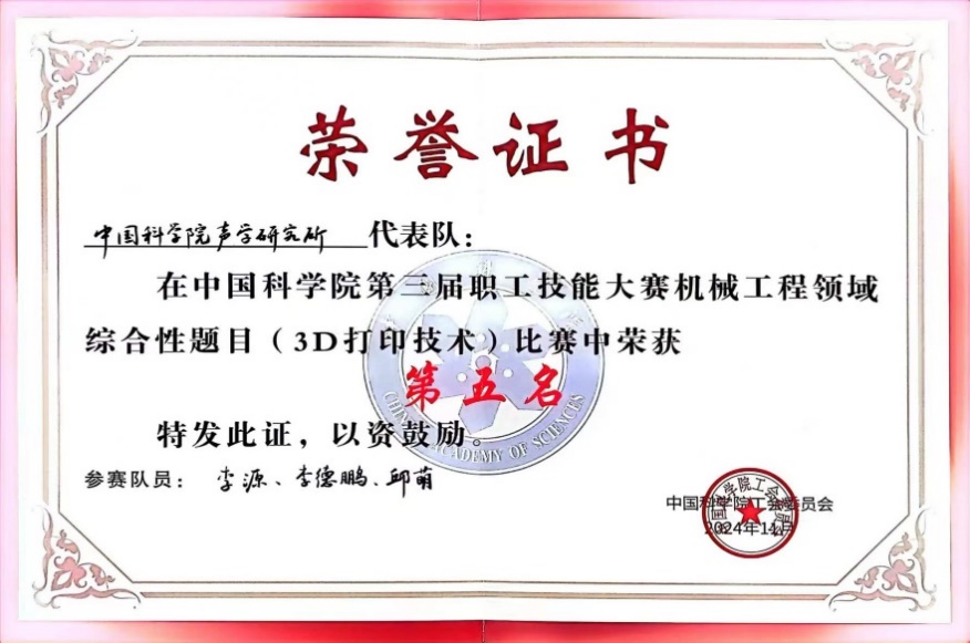 近日,中国科学院第三届职工技能大赛落下帷幕,声学所在本届职工技能大赛中取得优异成绩。2024年11月29日,在西安光机所举办的机械领域技能大赛中,声学所代表队分别参加了机械基础理论知识考试、先进功能结构3D打印设计、代表作展示三个赛道的比赛,取得团体优胜奖。其中,邱萌、李起忠分别获得机械基础理论考试第一名和第二名;李源、李德鹏、邱萌组成的代表队获得先进功能结构3D打印设计与应用项目第五名。11月27日,在计算机网络信息中心举办的网信应用服务领域大赛中,声学所吴京洪、刘照邻为主要成员参加的协作二片代表队,经过初赛和决赛的激烈比拼,获得网信应用服务领域网信应用创新赛三等奖。