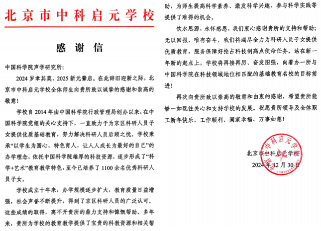 2024年12月30日,声学所收到了来自北京市中科启元学校的感谢信,信中中科启元学校对声学所大力支持周边院校科教事业、有力有效开展科普宣教工作表示充分的肯定和诚挚的感谢。