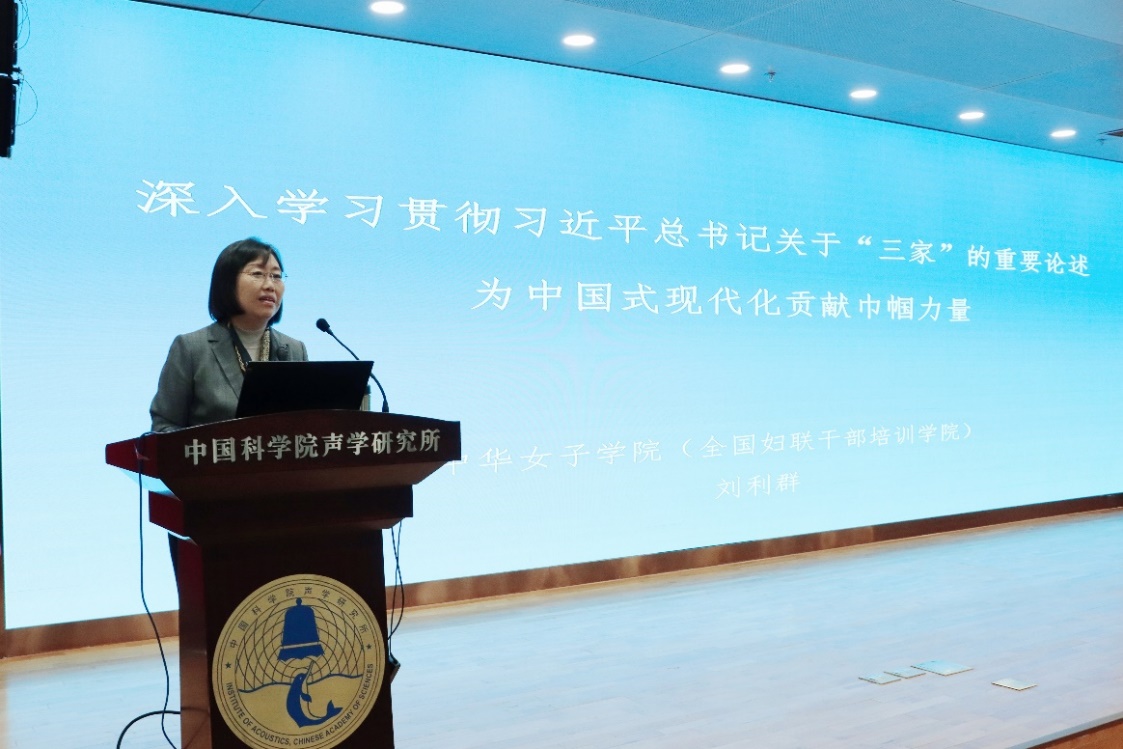 报告会由所妇委会主任金赛敏主持。声学所女职工和女学生共计180余人参加报告会专题学习。