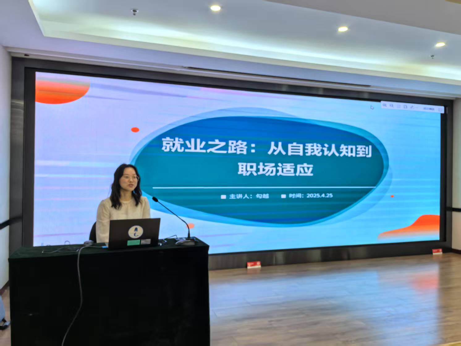 2019届毕业生勾越(现就职于京东方科技集团股份有限公司)以《就业之路:从自我认知到职场适应》为题,结合自身职业发展经历,详细剖析了从校园到职场的角色转变,并分享了如何通过清晰的自我定位实现职场快速成长。