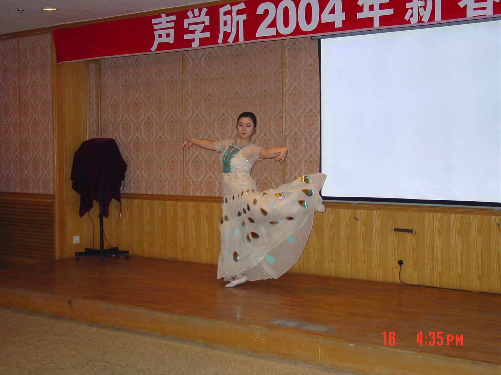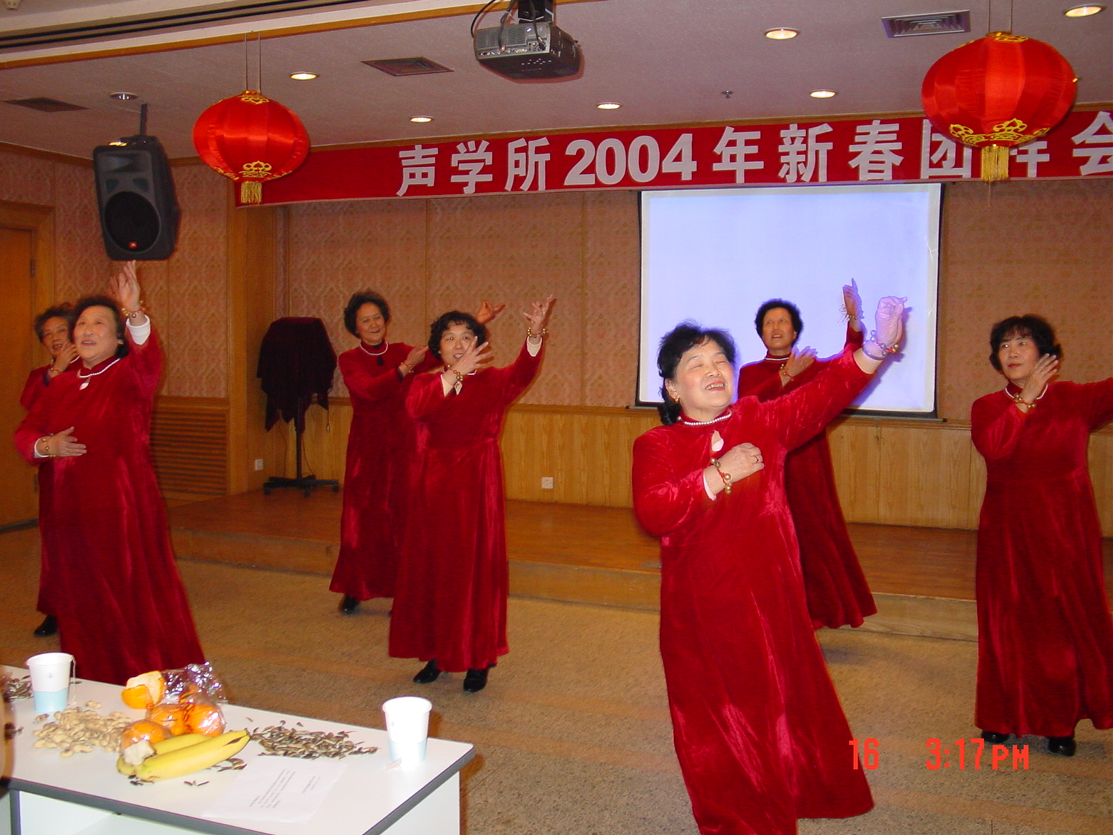 接下来,声学所退休职工自编自演了一曲“手铃舞”。随后,大家纷纷登台表演了各种节目,有男女声对唱,孔雀舞、丝巾秀,葫芦丝吹奏等,精彩的节目引来阵阵如潮的掌声。联欢会还穿插有多个既风趣幽默又充满寓意的游戏。其中,名为“青春的回忆”游戏,通过让年轻同志现场辨认老照片上的老一辈声学工作者,以轻松活泼的形式对年轻人进行了一场声学所历史和传统的教育。