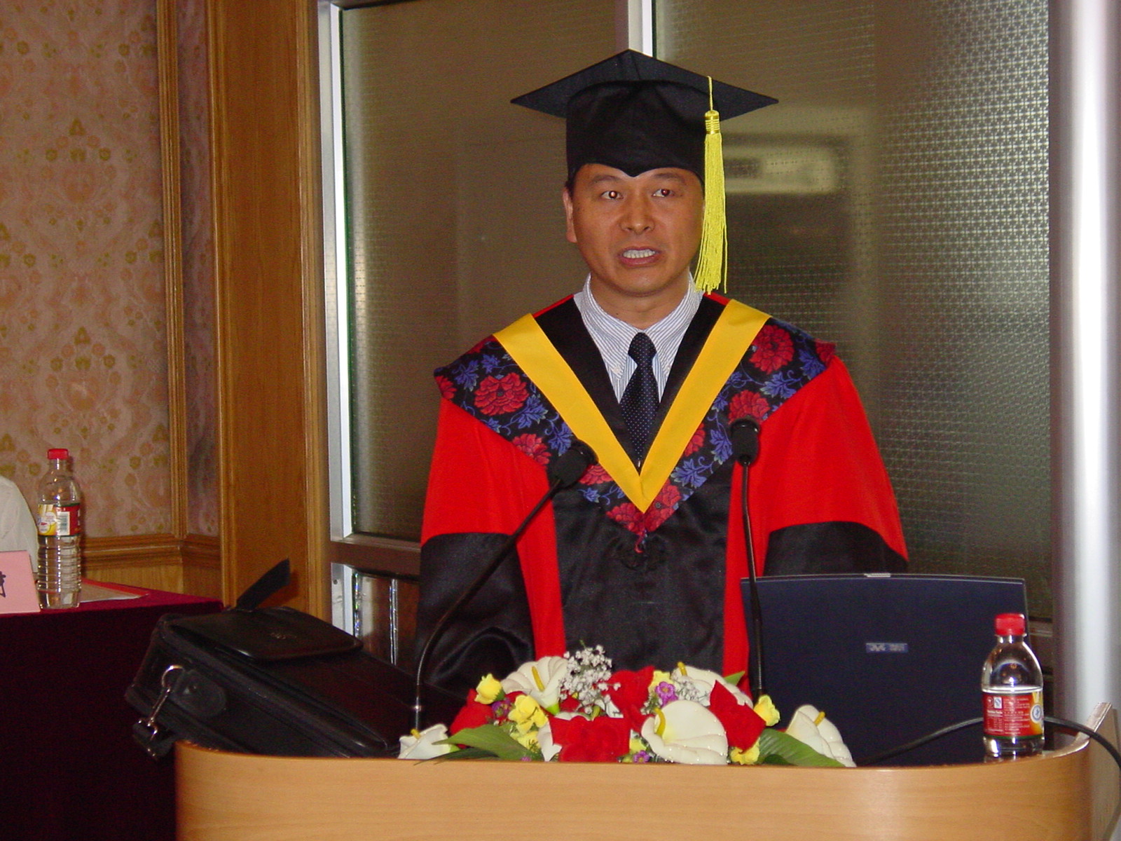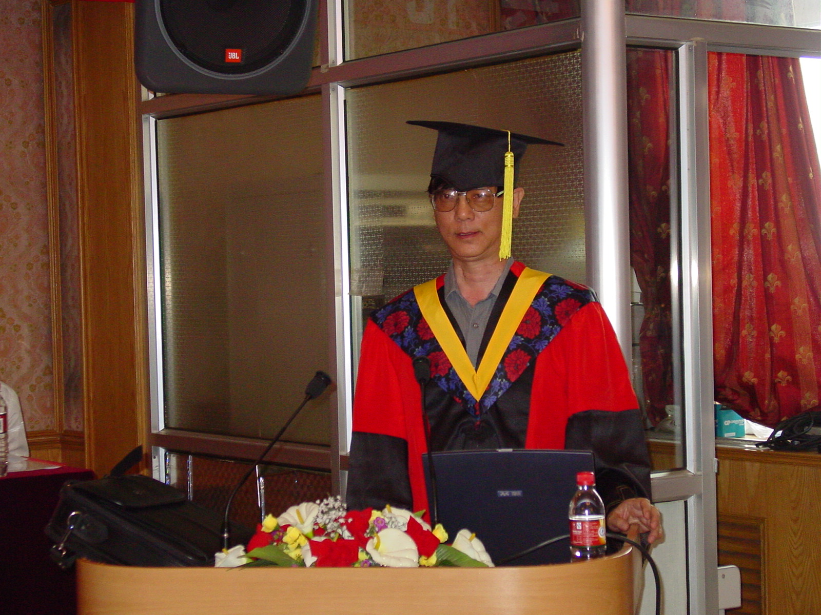 声学所2004年研究生毕业典礼于2004年7月6日下午在DSP大楼多功能厅召开。主席台上鲜花绽放,阵阵芳香在空气中弥漫开来,会场到处充满着收获的欢笑声,气氛轻松热烈。