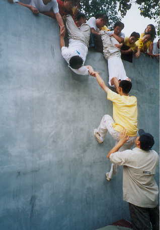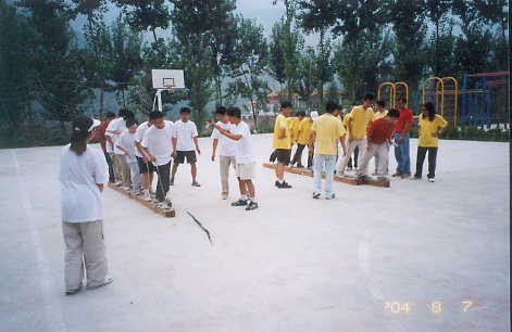 到达幽谷神潭基地后,首先组建了“超越”队和“鲨鱼”队,两个队分别自制了队旗、队徽,自编了队训、队歌,在培训师的带领下,开始了幽谷神潭的峡谷淘金之路。