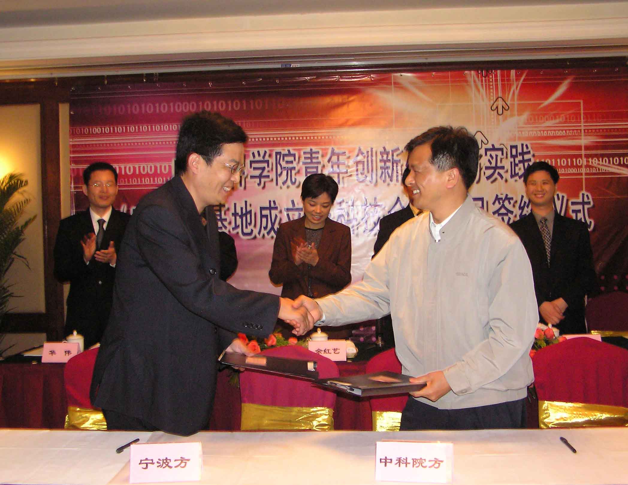 10月20日晚17:30分中科院青年创新研究与实践(宁波)基地成立暨科技合作项目签约仪式在宁波开元大酒店华光厅隆重召开。中科院副院长白春礼、宁波市副市长余红艺、声学所所长田静、自动化所所长谭铁牛、计算所副所长樊建平、宁波市科技局副局长张建国等领导同志出席会议。中科院副院长白春礼、宁波市副市长余红艺先后发表讲话。