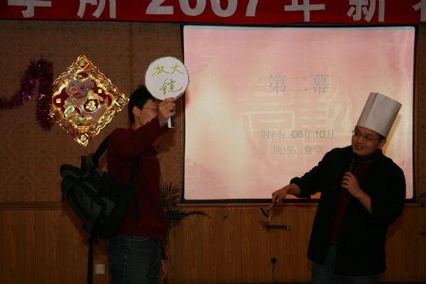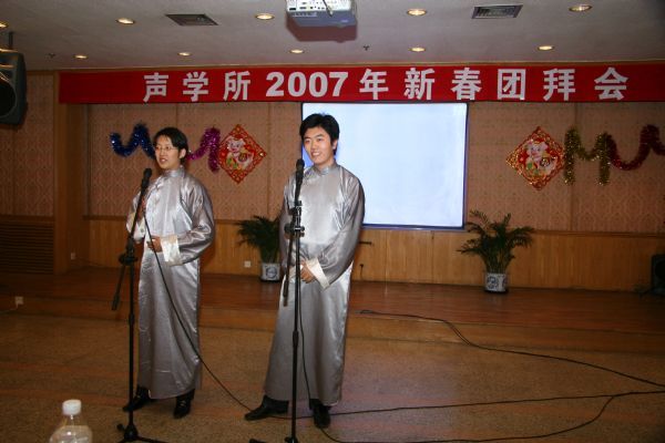 2007年2月6日下午,DSP大楼多功能厅里,一片欢声笑语。窗外寒风凛冽,屋内春意融融。这里正在举行声学所2007年新春团拜会,宽阔的屋子里坐满了人,但还有很多人站在过道里,挤在大门口,熙熙攘攘,好不热闹。
