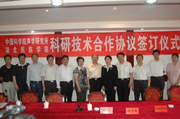 2007年5月22日,声学所与湖北民族学院在湖北省恩施市签订《合作协议》,双方确定在相关科研教学领域的科研开发、学术交流、人才培养及平台建设等方面开展广泛深入的合作。声学所副所长居琦和湖北民族学院党委书记胡茂成分别代表合作双方在协议上签字,全国人大常委、民进中央副主席王佐书、恩施州委常委、宣传部部长吴希宁、恩施州人大副主任马春菊、湖北民族学院副院长谭志松、汪兴平以及宣传部、组织人事部、教务处、科技处负责人和信息工程学院部分老师,声学所声纳工程设计实验室主任蔡惠智研究员、科技处相关同志出席签字仪式。