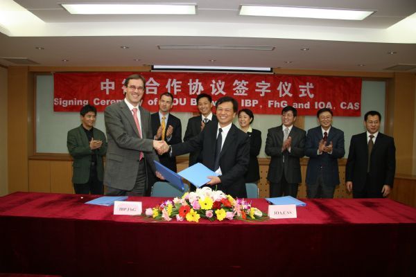2007年11月29日至12月4日,德国弗劳恩霍夫应用研究促进协会建筑物理研究所(Fraunhofer Institute of Building Physics,Fraunhofer-Gesellschaft)声学研究室负责人Philip Leistner博士及Horst博士、周小儒先生一行,来声学所进行了访问和学术交流,并代表建筑物理研究所(IBP)与声学所签订了合作协议。