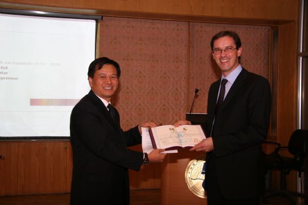 德国弗劳恩霍夫应用研究促进协会是德国同时也是欧洲最大的应用科学研究机构,重点在工程科学领域开展应用研究工作。其下属建筑物理研究所(IBP)在建筑声学、环境声学方面开展了多年的研究工作,取得了很多有影响的科研成果,并在工程领域得以广泛应用。德国弗劳恩霍夫应用研究促进协会致力于开展国际合作,早在1985年,就与中国科学院签订了科技合作协议。IBP和声学所长期以来一直保持着良好的交流、合作关系。1997年,德国弗劳恩霍夫应用研究促进协会向声学所马大猷院士颁发了弗劳恩霍夫金质奖章及ALFA奖,以表彰马大猷院士在噪声控制领域的突出贡献。马大猷院士的微穿孔吸声理论在噪声控制领域得到世界范围内的认可和应用,IBP起到了重要的推广和促进作用。