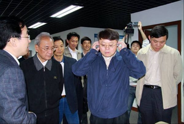 江绵恒副院长观看扬声器在线检测仪工作情况