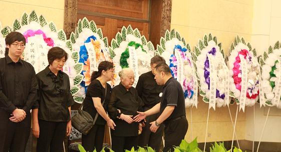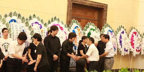 6月30日晚,噩耗传来,全所上下十分悲痛。在应崇福院士治丧委员会的指挥下,应院士治丧办公室连夜在所内设立了灵堂,供全所同志和社会各界人士前来悼念应崇福院士,表达缅怀之情。灵堂庄严而肃穆,灵堂门口“崇山之尊 先于人杰 安乎超然;福海之阔 生于地灵 息乎空化”的挽联寄托了对应先生无尽哀思。灵堂内哀乐低迴,束束鲜花簇拥着应先生的遗像,所领导、机关各职能部门及实验室的同志们24小时为应先生守灵。声学所各实验室、机关以及后勤保障部门的科研管理骨干、广大职工及青年学子500余人,自发地集体到灵堂追思应崇福院士。中科院高技术局田静局长、国家自然基金委张守著处长、张仁和院士、李启虎院士、侯朝焕院士、汪承灏院士,以及来自有关研究所领导、中国科大、清华大学、中科院研究生院、南京大学、同济大学、中国声学学会、中国声学标准化技术委员会、中科院侨联及海淀区侨联等单位代表闻讯纷纷赶到灵堂吊唁。