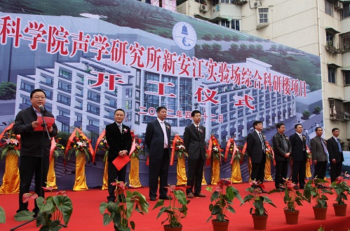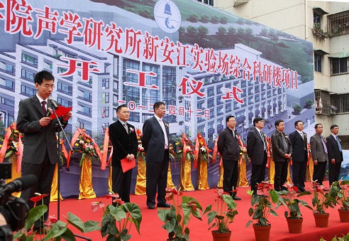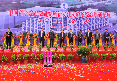 2012年4月12日,我所新安江实验场综合科研楼项目开工仪式在浙江省淳安县千岛湖镇举行。王小民所长、倪宏副所长副书记、中共淳安县委常委汪建华部长、淳安县人民政府王军副县长、声学所行政资产处刘宏伟处长、东海站胡长青站长及地方政府相关部门领导和各有关方面30余位嘉宾出席了项目开工仪式。