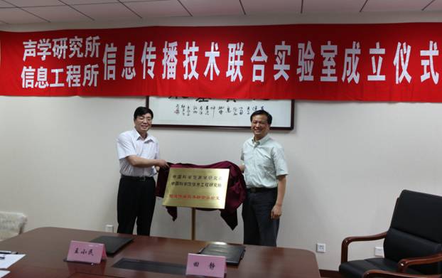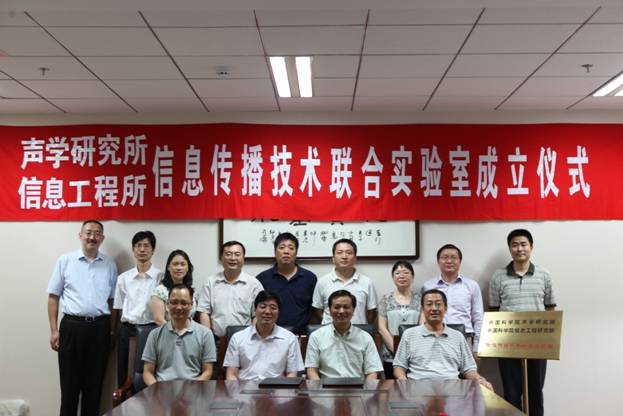 2012年6月27日,中国科学院声学研究所(以下简称声学所)与中国科学院信息工程研究所(以下简称信工所)举行了“信息传播技术联合实验室”的签约揭牌仪式。声学所出席签约仪式的有:王小民所长、李风华副所长、高性能网络实验室慈松主任、国家网络新媒体工程技术研究中心王劲林主任、中科院噪声与振动实验室杨军主任、科技处周城光副处长等;信工所出席签约仪式的有:田静所长、孙德刚副所长、郭莉所长助理、科技处李凤华处长以及研究室黄伟庆主任等。中国科学院高技术研究与发展局信息技术处付广义副处长参加了签约仪式。会议由声学所李风华副所长主持。