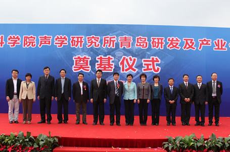 2012年10月26日上午,中国科学院声学研究所青岛研发及产业化基地奠基仪式在青岛国家高新技术产业开发区举行。山东省科技厅党组书记、厅长翟鲁宁,中共青岛市委常委、红岛经济区工委书记、管委主任、高新区工委书记陈飞,青岛市政协副主席、青岛大学副校长邵峰晶,青岛高新区工委副书记、管委主任赵兴书,中国科学院声学研究所所长王小民等领导出席奠基仪式,并共同为声学所青岛基地建设项目奠基培土。