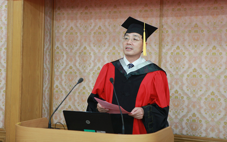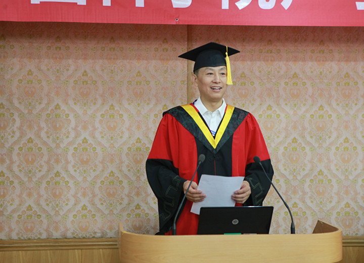 王小民所长首先致辞,他向2018届毕业生顺利完成学业表示热烈祝贺,肯定了同学们在声学所的发展中做出的贡献,并根据当前国家面临的复杂形势,希望同学们将个人理想同国家发展紧密联系在一起,在科技创新的大潮中奋力拼搏,做出贡献。并以“为天地立心,为生民立命,为往圣继绝学,为万世开太平”寄语毕业生。