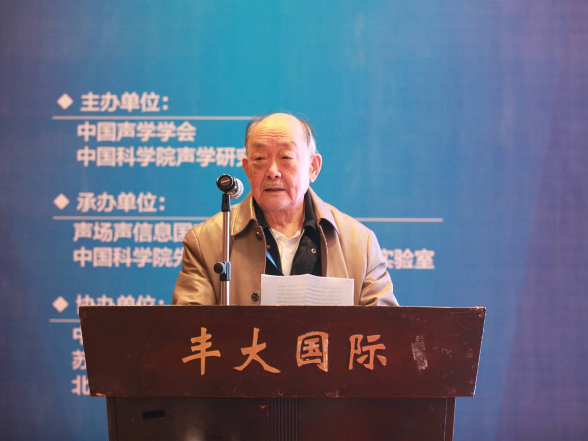 中国声学学会名誉理事长杨士莪院士致辞。杨院士介绍了中国声学学会的发展历程,并号召广大声学科技工作者积极加入中国声学学会这个全国性、学术性、公益性的社团组织,通过参加形式丰富的学术交流活动,及时了解声学学科的最新进展,同时,也勉励中国声学学会不断提高自身实力、扩大影响力和知名度,为会员提供更多服务,为国家发展贡献才智和力量。