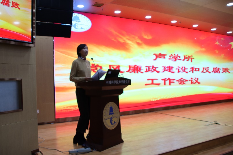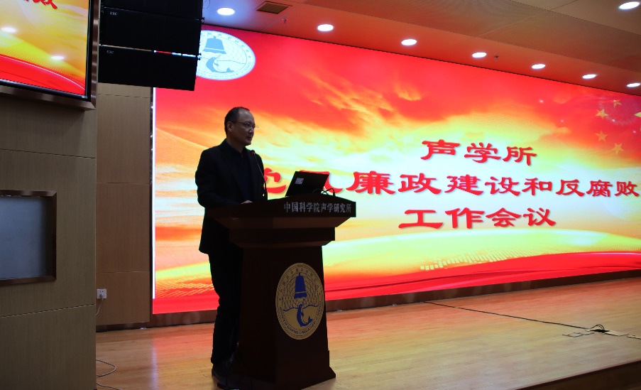 所长李风华作廉政讲话。他结合声学所实际,对深入做好反腐倡廉工作明确提出三点要求。一是全所职工要进一步提高政治站位,务必认真学习党的二十大对党风廉政建设和反腐败工作的要求,深刻领悟落实党风廉政建设责任制的重要意义。各部门、各实验室、各研究站负责人要切实扛起党风廉政建设的责任,履行好“一岗双责”,常抓不懈。二是各级“一把手”要树牢责任意识,规范管理,合法合规使用科研经费,防范廉洁风险,切实管好自己人,加强廉洁教育、日常管理、监督约束。三要大力弘扬科学家精神,涵养优良学风,严守科研诚信。声学所人要深刻领会科研诚信是科技创新的基石,牢记所训,力戒浮躁、安心致研,营造风清气正、蓬勃向上的科技创新生态。