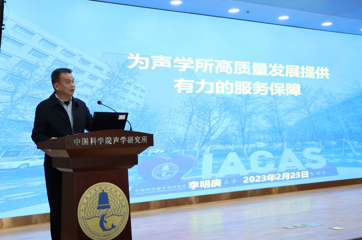 李明庚作《为声学所高质量发展提供有力的服务保障》报告,结合声学所2022年经费总体情况介绍了科研经费管理使用的规定与要求,提醒审计和审价工作的典型问题,提出了下一阶段科研保障体系建设的重点任务。