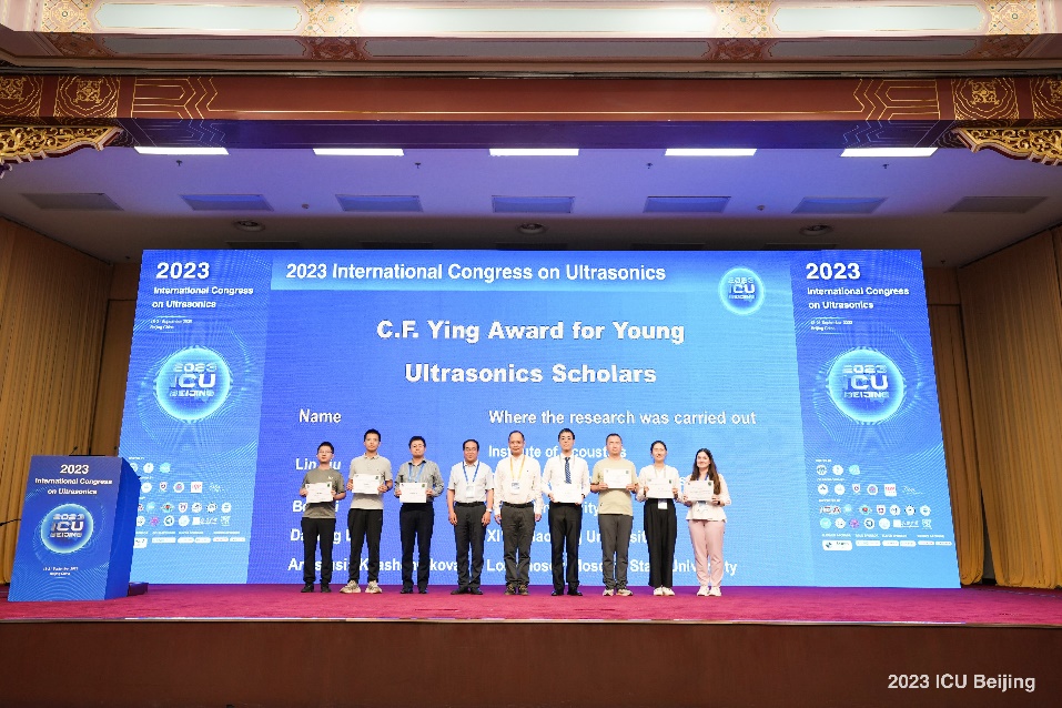 9月21日下午的闭幕式上,国际超声大会委员会秘书长Sigrun Hirsekorn博士为Silver Whistle Award奖获得者南京大学屠娟博士颁奖,国际超声大会常任理事、Ultrasonics主编苏众庆颁发了RWB Stephens Prize奖及提名奖。为鼓励年轻学者们潜心科研,会议特别设立了C.F. YING Award(应崇福奖),国际超声大会副主席他得安教授宣读了C.F. YING Award奖及提名奖,李风华研究员为获奖者和提名者颁发了证书。