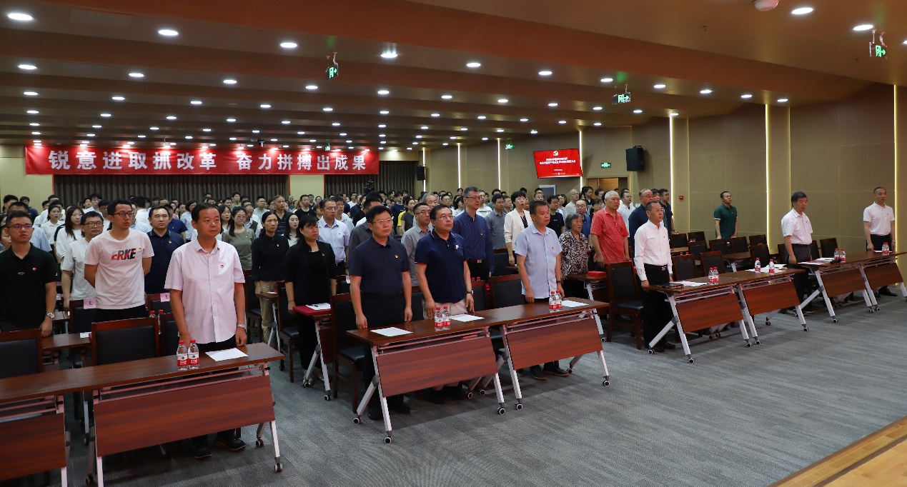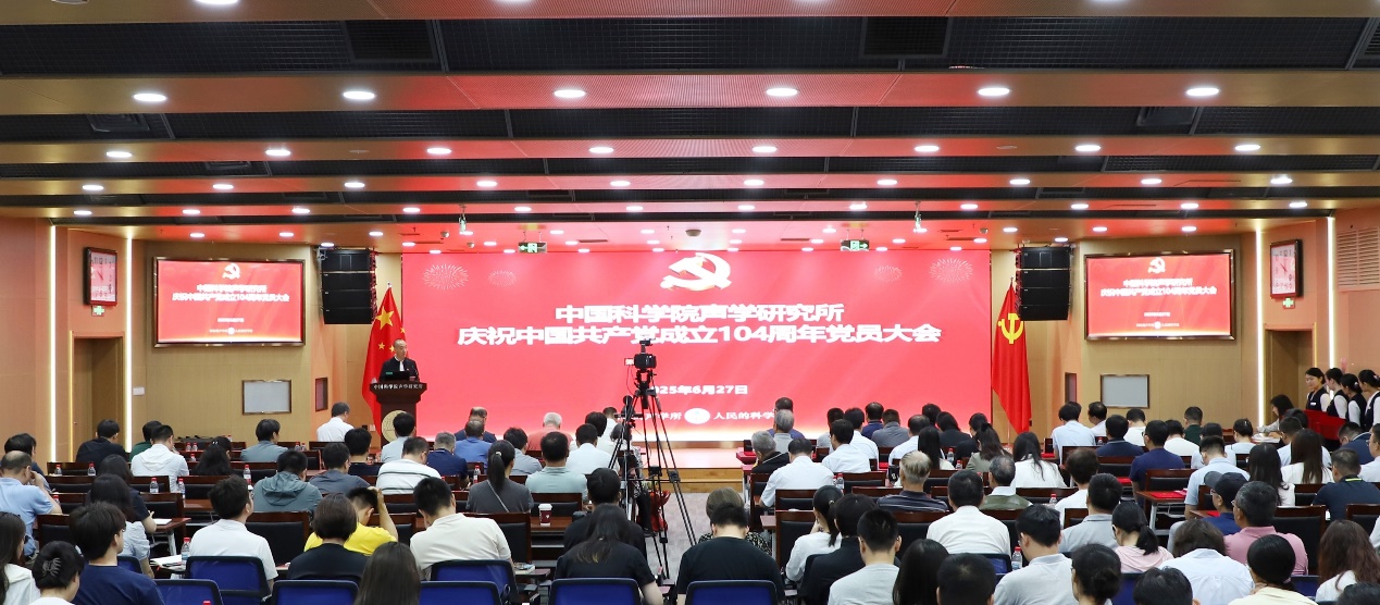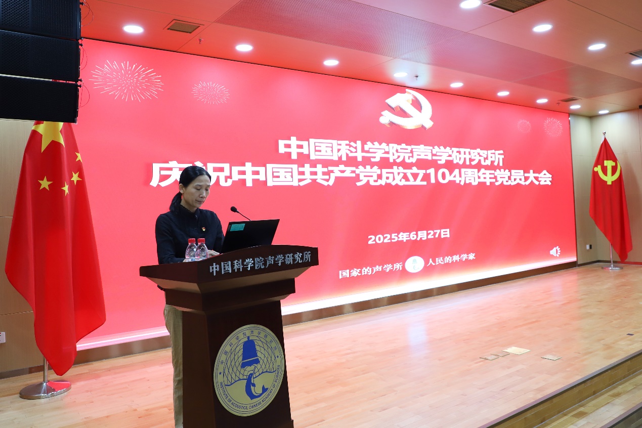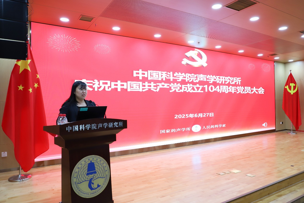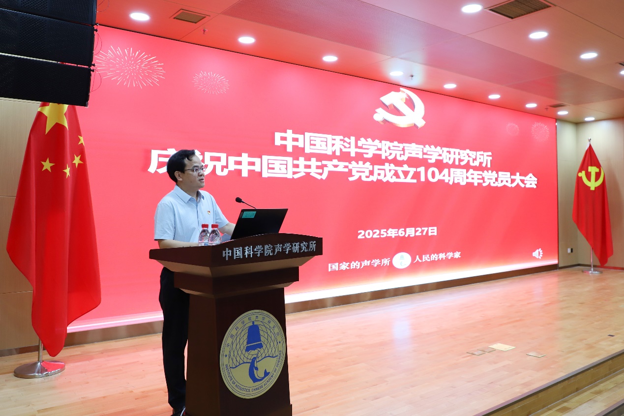 为庆祝中国共产党成立104周年,扎实推进深入贯彻中央八项规定精神学习教育,2025年6月27日上午,声学所召开庆祝中国共产党成立104周年党员大会,党委书记库卫群作专题党课报告,会议举行新入党党员宣誓、“光荣在党50年”纪念章颁发和“两优一先”表彰仪式,所领导班子成员、党委委员、纪委委员、支部书记及支委、受表彰人员、新入党党员,以及职工和学生党员等300余人参加会议。三个研究站党委及外场试验团队以视频形式参会。纪委书记王雷主持会议。