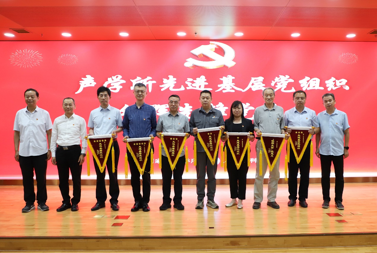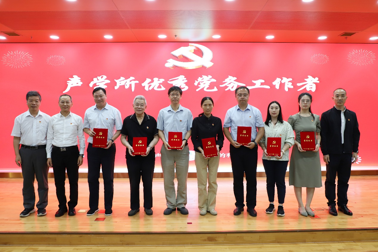 所领导、党委委员向荣获声学所先进基层党组织、优秀共产党员、优秀党务工作者称号的集体和个人颁发锦旗、证书。会议还对先进团支部、优秀团员、优秀团干部进行了表彰。