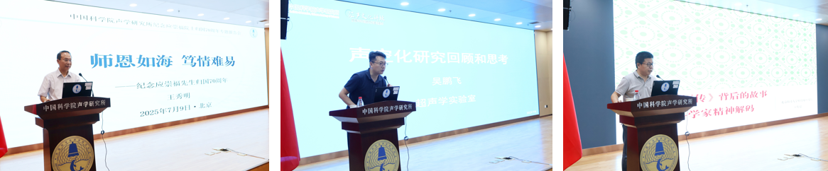 在专题报告环节,应崇福院士的学生、声学所首席科学家王秀明研究员作题为《师恩如海 笃情难易》的报告。他结合珍贵史料和亲身经历,生动讲述了应院士在声学基础研究和国家重大任务中的开创性贡献,并分享了其治学育人的感人往事。吴鹏飞副研究员在《声空化研究回顾和思考》学术报告中,系统梳理了应院士开创性工作的学术脉络及其当代发展与前沿思考。《应崇福传》作者王传超副教授从传记创作视角,解密了应院士当年毅然归国、带领团队白手起家的动人篇章。