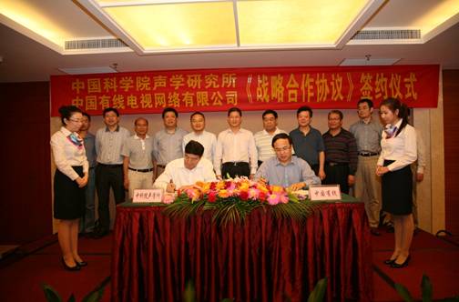 2012年12月21日下午,中国科学院声学研究所与中国有线电视网络有限公司在海南省海口市签订了《战略合作协议》。中国科学院声学研究所王小民所长和中国有线电视网络有限公司沈向军副董事长、总经理作为签约人签约,海南省科技厅副厅长王利生、文体厅巡...