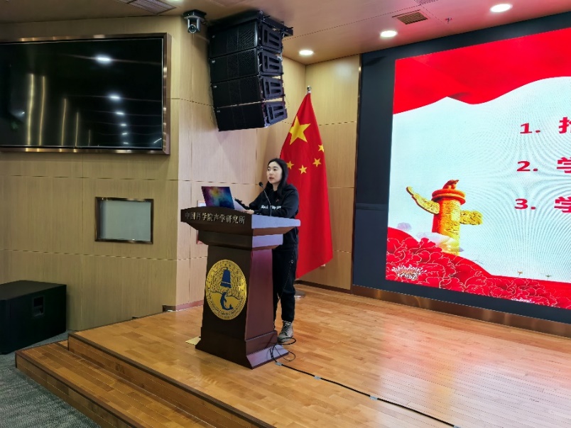 苏畅带领与会人员集中学习党的二十届四中全会精神,结合科研工作实际,重点解读了“十五五”规划建议中与科技相关的战略部署,并动员大家紧密结合中国科学院和声学所“十五五”科技布局,为规划编制积极建言献策,主动争取和承担国家重大科技任务。她强调,作为科研工作者,必须以加快实现高水平科技自立自强为己任,着力引领发展新质生产力,持续强化原始创新与关键核心技术攻关。