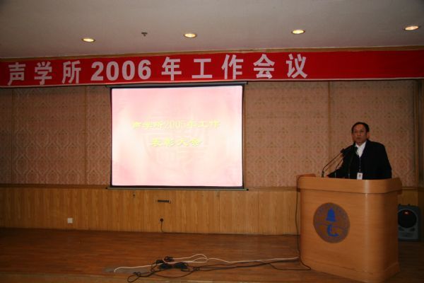 ![]() 景荣才副书记主持表彰会 2006年1月15日上午,声学所在DSP大楼四层多功能厅召开2005年度工作表彰会,对2005年度全所表现突出的各个方面的工作进行了总结,对国防科技二等奖获得者、重大项目进展奖、发明专利申请先进单位、软件登记先进单位、发表论文先进个人、政务信息和宣传先进单位、安全评比先进单位及个人、保密工作先进单位及个人、优秀团员等进行了通报表彰。景荣才副书记主持了会议,田静所长、潘锋、居琦副所长等所领导参加了表彰会。