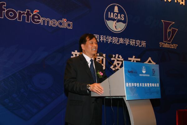 新闻发布会上,中国科学院声学研究所所长田静博士、中科信利公司董事长颜永红博士、富迪公司董事长兼CEO黄炎松博士分别发表讲话,对通信声学的发展状况、产业化前景和三方策略联盟的组建等情况进行了详细的介绍。