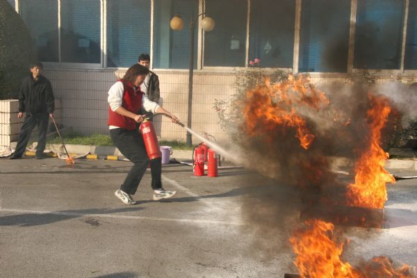 之后,各部门的19个代表队分组进行了消防演练比赛。参赛队员分成男、女两个大组。先进行女子组比赛,后进行男子组比赛。每次同时2人参赛,分别记录每人跑完规定距离并灭掉火源的时间。比赛最终成绩以每队2人成绩总和为准,用时短者胜出。面对熊熊火势,选手们毫不畏惧,手提灭火器手柄,迅速奔赴火场,熟练的除掉封铅、拔掉保险栓,一手握着喷管,一手提着压把,向着火源根部喷射,迅速扑灭火源,一个个俨然职业消防队员。最终,人事教育处、办公室及环声物业有限公司三个代表队分获冠、亚、季军。