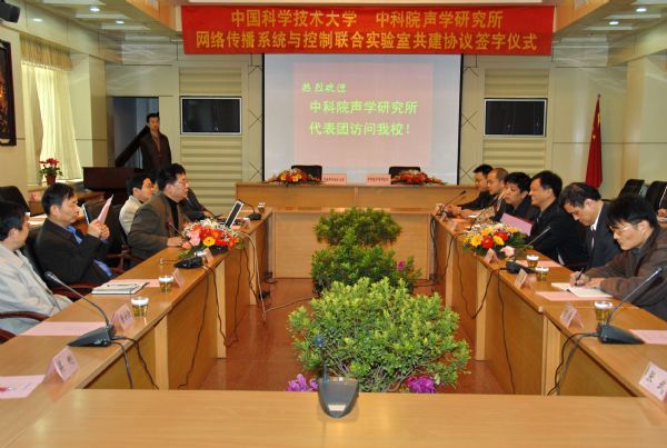 签字仪式在中国科技大学办公楼第一会议室举行。声学所所长田静、所长助理黄正、网络与新媒体技术研究中心主任王劲林研究员、倪宏研究员等一行8人与中国科技大学党委常务副书记、副校长许武、副校长王东进及其校党政办、人事处、科技处、信息学院、自动化系等有关单位负责人出席了签字仪式。