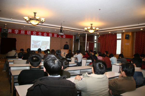2006年12月8日下午,声学所DSP大楼的多功能厅里,近百名朝气蓬勃的年轻学生齐聚一堂,这里,声学所研究生会换届大会正在隆重举行。同时来参加此次换届大会的还有人教处副处长卢美英老师,以及来自中科院研究生院学生会的副主席侯秋菊、任嘉、王丽琴三位同学等。会议由第六届研究生会主席陈佳路主持,以其为代表的新一届研究生会与以熊亮为代表的老一届研究生会在这里悉心交流,总结过去,展望未来。